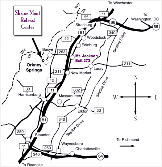 To reach Shrine Mont, follow Route 66 West to I-81 South to Mt. Jackson (Exit #273). Turn left onto Rt. 703 (East), then right (South) on US 11, follow through town, turn right on Rt. #263 and follow approximately 13 miles to Orkney Springs.